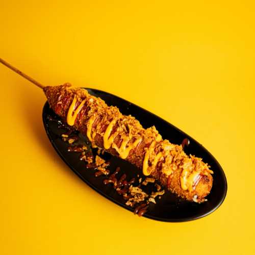 Hot dog façon coréenne, saucisse de poulet, mozzarella avec sauce moutarde et ketchup